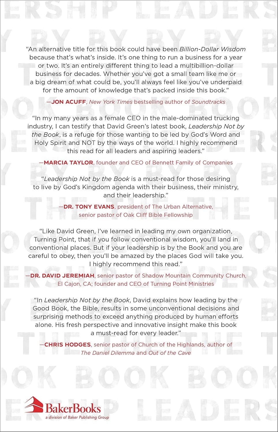 Dr. Tony Evans (Senior Pastor of The Urban Alternative, Oak Cliff Bible Fellowship) says, Leadership Not By the Book is a must-read for those who want to live their work, desires, and leadership according to God’s Kingdom agenda Dr. David Jeremiah (Senior Pastor of Shadow Mountain Community Church and founder/CEO of Turning Point Ministries) adds, Like David Green, I learned that if you follow conventional wisdom in leading your organization, you’ll stay in conventional places. But if your leadership is by the Book, you will be amazed where God takes you.