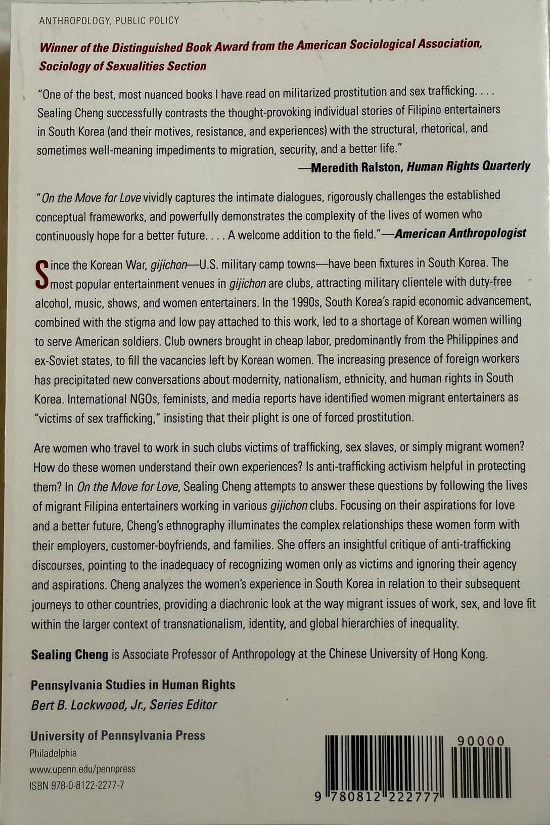 Sealing Cheng’s acclaimed work On the Move for Love examines life in the gijichon (military camp towns) that developed around U.S. military bases established in South Korea since the Korean War. The book focuses particularly on the experiences of Filipino migrant women working in the entertainment industry in these areas.