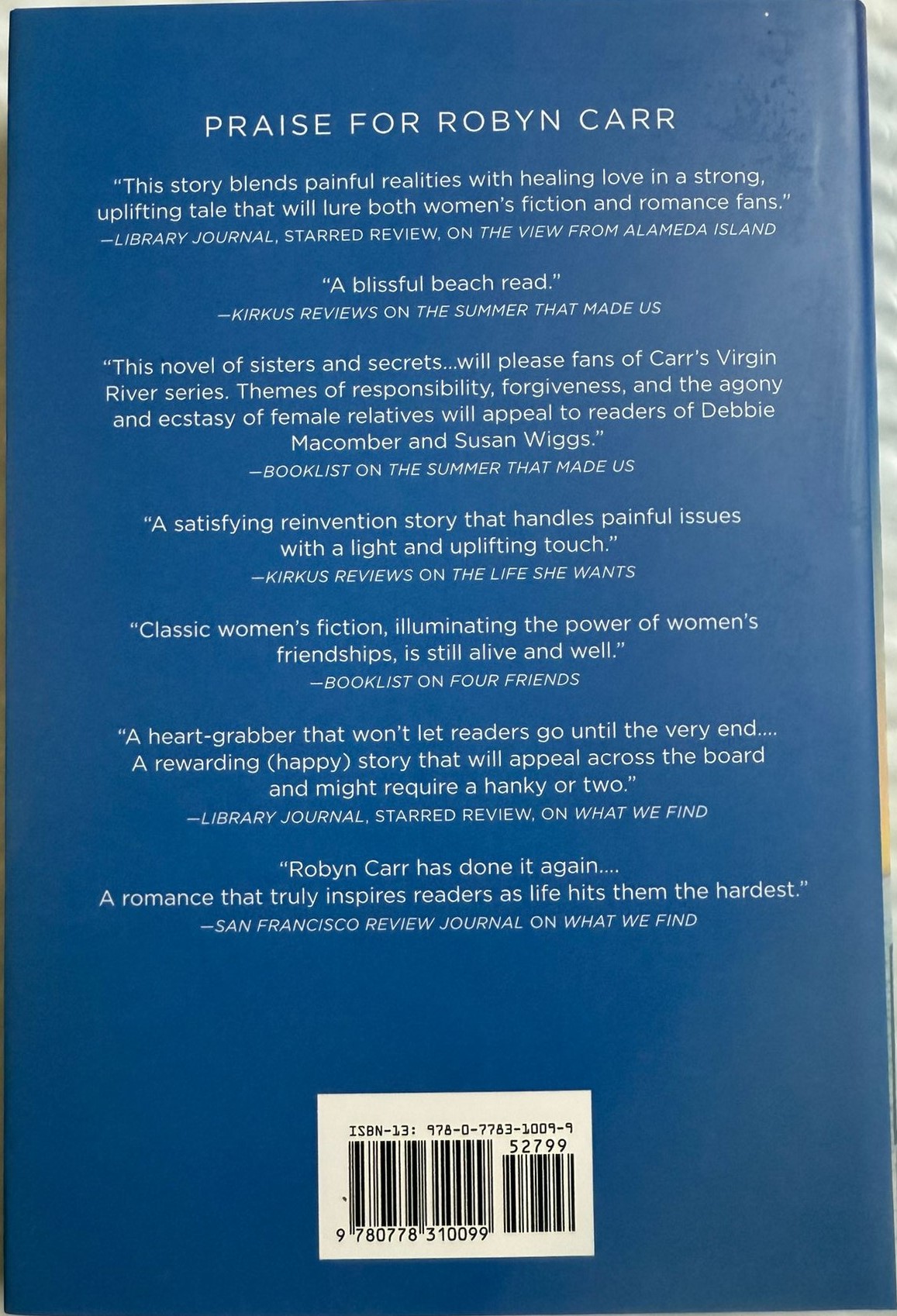 Booklist (on Four Friends) remarks, The classic, illuminating women’s fiction about female friendships is alive and well, while Library Journal (on What We Find) points to its emotional depth and calls it a rewarding (and potentially tear-jerking) story that will keep readers hooked. The San Francisco Review Journal (on What We Find) applauds Robyn Carr for once again delivering a romance that truly inspires readers during life’s hardest moments.
